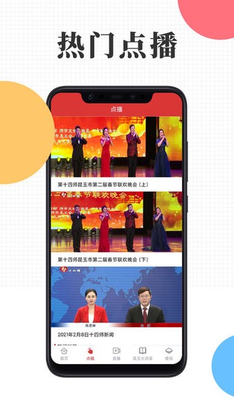 云上昆玉APP涵盖十四师地区的各类电视新闻、报纸新闻和调频94.5十四师新闻综合广播。