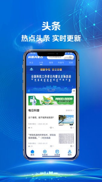 主要用于向用户提供免费的科普知识宣传,让大家了解更多科普知识,,平台细分为关注、头条、推荐、科普号几大板块。内蒙古12盟市下设12科普号,可以各自上传科普知识。