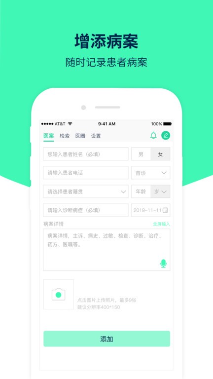 点击新增病案,根据提示输入患者的基本信息,并拍照上传病历照片
