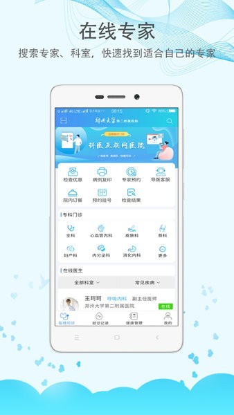 通过郑大二附院app,在线预约医院各科室专家、普通门诊。