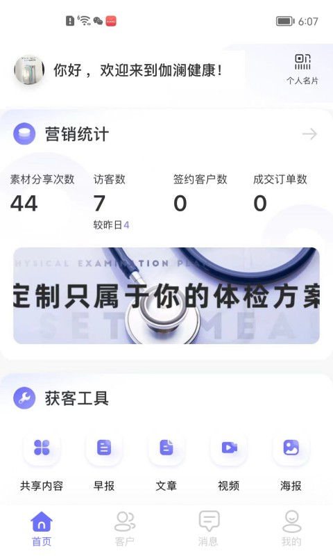 伽澜健康管家手机最新版是为合伙人以及工作人员打造的营销管理软件,这里有丰富的素材资源,用户可以编辑和分享,能查看每天的访客数、签约客户数以及成交订单数,能便捷的进行客户以及访客的管理,可以在线看每天的早报,超多获客小工具可以使用。