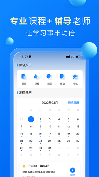采用在线直播+录播模式授课,在线题库,摆脱传统教学时间、空间的限制,让学习更自主更便捷。