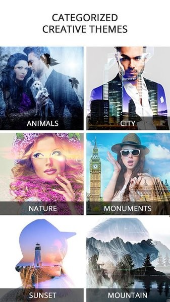 Photo Blend提供分类混合效果,如:自然,日落,城市,山脉,纪念碑,动物等,多种混合风格和预先创建的预览,以创建每次完美的混合图片。