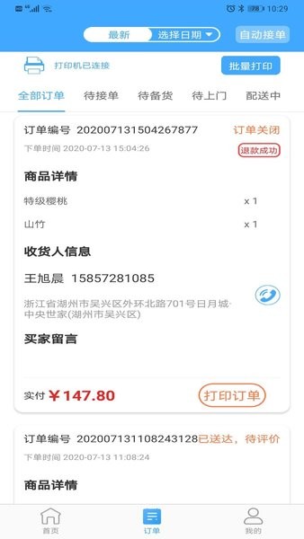 详细的订单详情随时查看,能够更好地进行订单退款、订单打印、一键接单;
