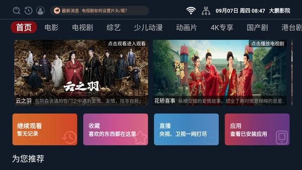 大鹏影院电视版是一个可以在电视上追剧的平台,资源超丰富,电影、电视剧、动画片啥的都有,更新也很及时,想看什么都能找到。最棒的是它支持多条播放来源,想怎么看就怎么看,还能快速搜索和收藏,特别方便。特别是有直播功能,央视和卫视节目也能看,简直太实用了。