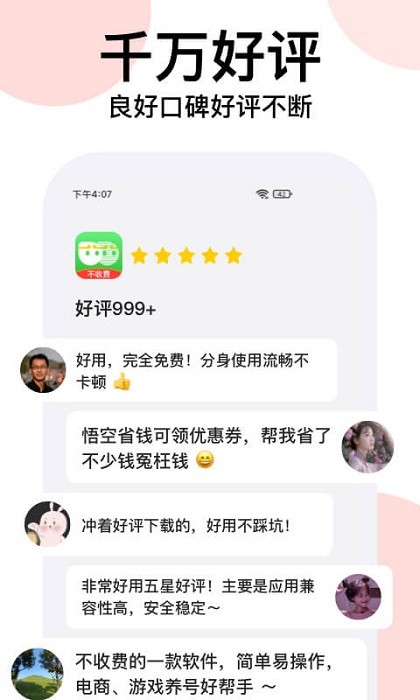 西游分身最新版本是悟空分身第二次改名的名字,除了名字改了以外,功能、界面还是和以前一样,为用户提供永久免费的多开分身功能,一键实现微信、qq等软件的双开;也可以多开游戏,用来挂机做任务,节约时间。
