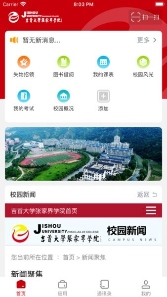 张家界学院的移动校园APP是个挺实用的东西,专门给师生用的。这个软件功能挺多的,学习上能查成绩、找空教室、借书啥的;生活上还能查水电费、看校园活动,感觉特别方便。APP设计得很全面,首页会显示最新的学校新闻和公告,还有图书借阅、考试查询这些实用的功能。特别是“失物招领”和“校园风光”这些小细节,让人觉得挺贴心的。