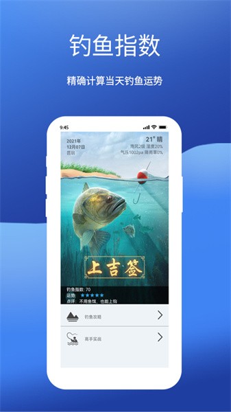 钓鱼天气:实时掌握钓鱼天气,不需要位置权限,实现不打扰,无推送。