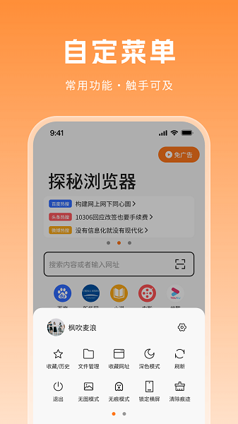 探秘浏览器官方版是功能强大的浏览器工具,收录了丰富的资源内容,支持广告拦截,没有广告打扰,界面布局简单,轻松搜索,内置百度、新华网、小说、电影、优酷登应用,随你访问浏览,一手掌握,运行流畅稳定,满足用户需求!