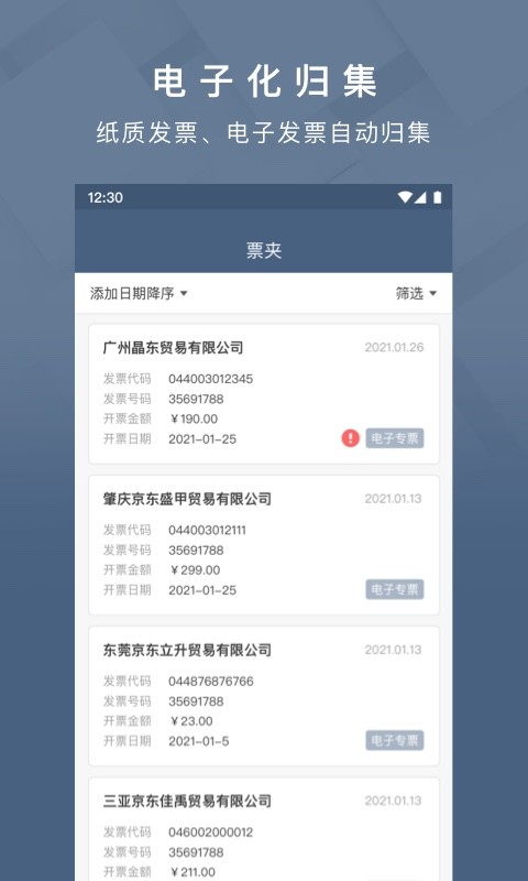 2、电子化归集:所有发票都支持电子化归集,保存发票的电子信息、影像信息、 查询方便。