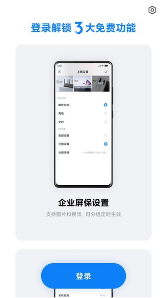 1、支持miu (企业版)的电视机绑定,支持向绑定的电视机远程批量分发相册,并远程设置定时关机。