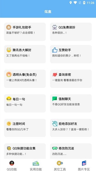 手游礼包助手、qq免费装扮、每日一句、强制聊天、拒绝添加好友等