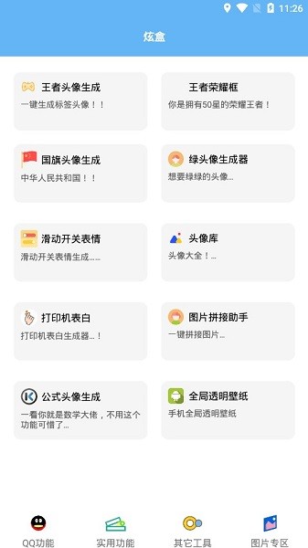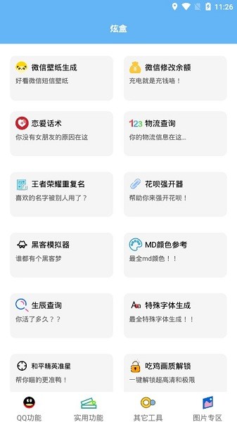 酷盒工具箱app是一款功能丰富好用的手机辅助工具箱,体积十分小巧,界面布局简单,集qq功能、实用功能、图片专区等内容服务为一体,分类清晰明了,大家可以根据需要自由选择,一键点击操作,功能免费使用,满足大家个性化需求。
