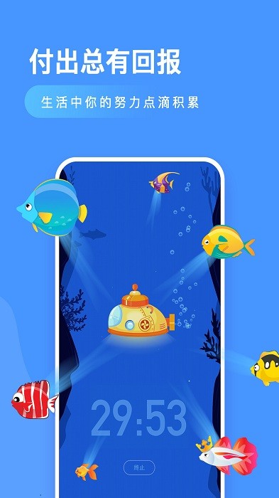 一款专注力养成工具。屏蔽手机内不重要的事项带来的干扰,集中专注力完成现实生活中的任务。通过潜艇下潜时间的累计,获得小鱼,并能喂养小鱼产生爱心,用爱心升级海底景观放松心情。查看往期时间分配情况定期进行时间规划,用这种休闲娱乐的方式逐渐形成稳定规律的专注习惯。