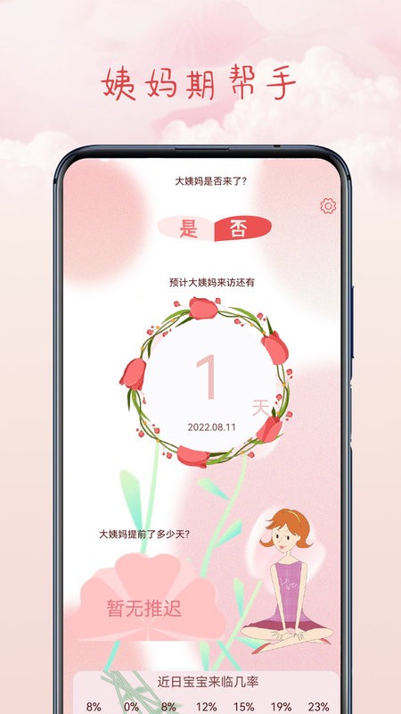 设置好月经大概规律,为您的下一次月经做倒计时,提醒您做好准备