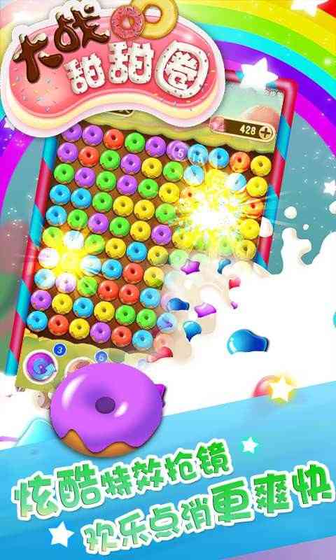 游戏中小伙伴们圣洁的小手,轻轻的对甜甜圈进行移动,相同颜色的蛋糕圈圈即可完美消除,消除魔法就这样没有征兆的被你唤起,想要更多的甜甜圈,那就用你的智慧,让更多的甜甜圈消除吧。