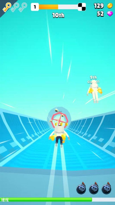 1、在跑酷的过程中玩家除了在速度上超越,同时你可以利用炸弹来炸你前面的人,点击瞄准仍;