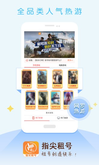 指尖租号app是一个提供安全专业的手游、端游、页游等账号租赁平台,致力于为玩家提供全网热门优质账号服务。数十万优质账号,24小时自动发号,全天候在线客服,指尖租号只为让您畅快体验高级虚拟物品带来的快乐!