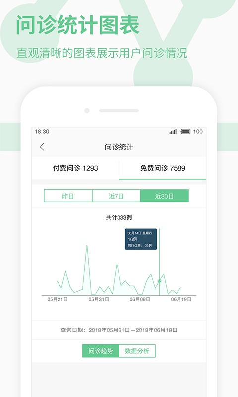 拥有非常清晰的问诊趋势,能看到不同时间段的问诊数量波动情况,还能查看详细的数据分析;