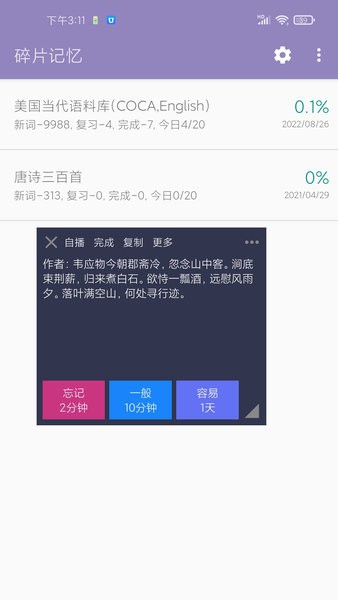 小众软件和最美应用联合推荐。碎片记忆利用悬浮窗或者桌面小部件强制背单词或是学习任何anki库,无需启动app,在你玩手机的同时记忆单词。
