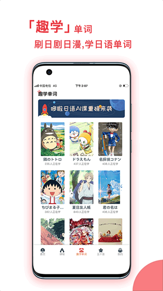 趣学日语app,你的必备日语学习神器。这是一款专门为广大的日语爱好者们打造的在线学习软件,内置丰富全面的日语知识让大家学习了解,以趣味教学的形式呈现日语知识,打造了轻松愉悦的学习氛围,超级的方便好用,有需要的朋友快来下载用起来吧!