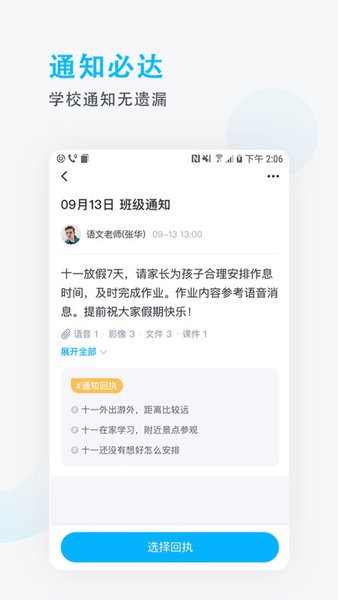 查看老师发布的学校通知和学习作业,支持提交通知回执和多种格式的作业;