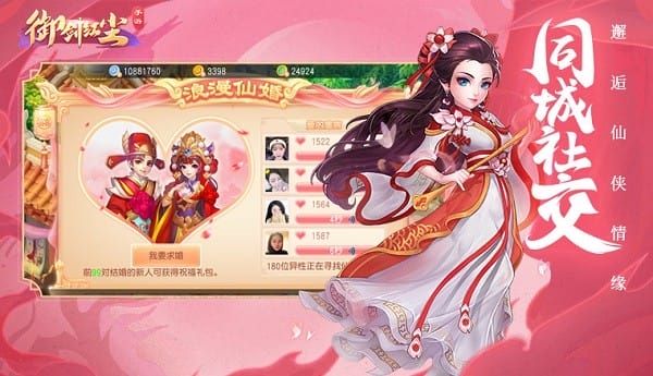 同城频道可即时语音连线,语音战斗实时指挥,挂机K歌欢乐成长。答题、红包、宴会、婚礼等各种有趣好玩的帮派活动,在不同的社交场景邂逅情缘,还有结婚生子,拜师学艺等多种情缘互动玩法,给你不同以往的社交体验