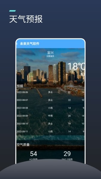 未来天气软件,未雨绸缪,来日方长。不管是晴天还是雨天,一路陪伴在你身边。实时监测,空气质量指数一目了然,健康又安心。