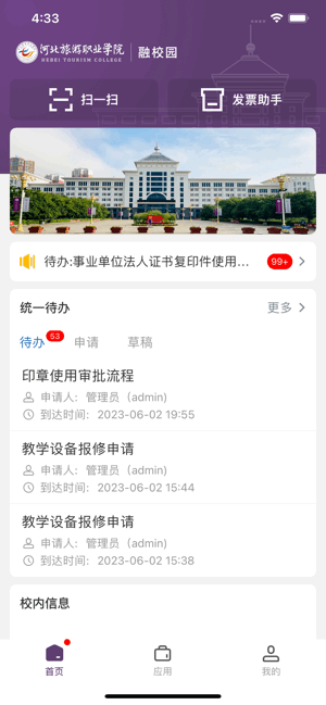 旅院融校园手机版是一款河北旅游职业学院专属的智慧校园软件,提供扫一扫、发票助手、待办任务服务,最新消息实时掌握,还带来教务域、会议通知、设备保修申请、我的工资等办公应用,便利校园生活,提高教务教学效率,管理方便!