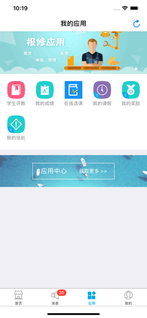 3、应用包括我的档案、德育量化、学生异动、宿舍查宿、学生奖励、学生惩处、电教报修、我的工资、教师课表、教学任务、我的课表、班级课表、总务报修、教师统计、请假管理等选项