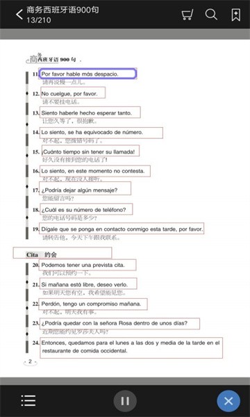- 西班牙语翻译;每个学习词语都标有标准西班牙语音频教学,标有对应的普通话与罗马音翻译。更好更准地学习西班牙语,出国留学旅游不再担忧。
