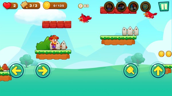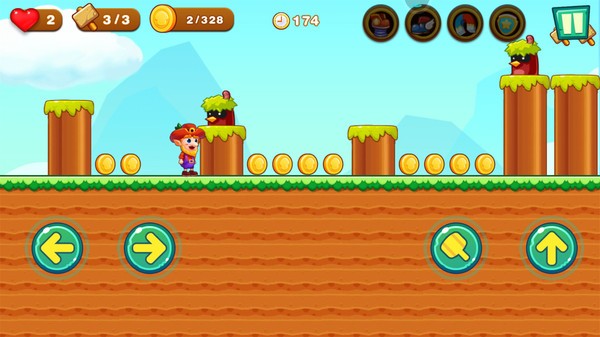 这是一款跑酷题材的冒险游戏,类似经典的FC小霸王游戏超级玛丽,可以采蘑菇,顶蘑菇,发射子弹,主人公为了寻找传说中的宝藏,踏上了冒险的旅程,游戏中共有5个不同的场景,多达80个精心设计关卡,无数种未知的怪物。