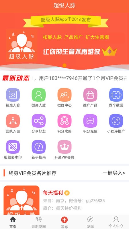 超级人脉app是专为微商、销售、店主、播商、视商、品牌方团队打造,扩展人脉,拓客引流,还可以向他人学习微商转型新零售销售经营方法,超级人脉是商家的出货圣地,超多微商宝贝、微名片,创业小白找项目找厂家找人脉、找货源、找代理的客源地。