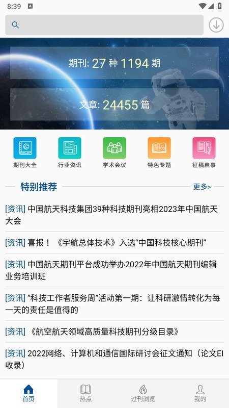我尤其喜欢它的“热点”功能,点进去就能看到大家都在关注什么关键词,感觉像有个 insider 告诉你航天圈的风向。而且过刊浏览功能也很贴心,想查过去几年的文献根本不在话下。
