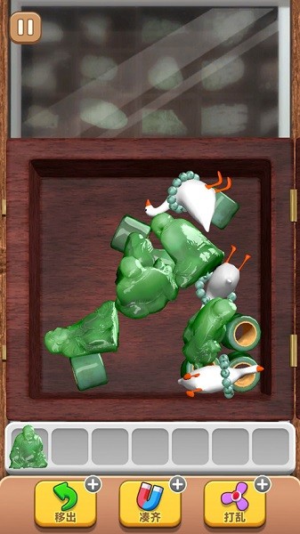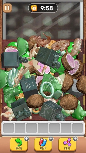 2、第二关难度暴增,游戏物品超多;玩家可使用道具进行帮助,如“移出”道具,可将3个物体移出格子并放在暂存栏;