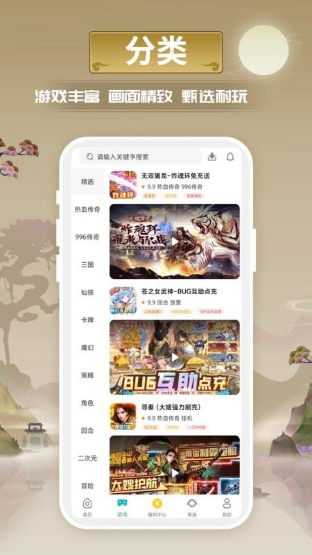 1、游戏品类齐全,三国,卡牌,传奇,仙侠,策略,回合等分类细致交流