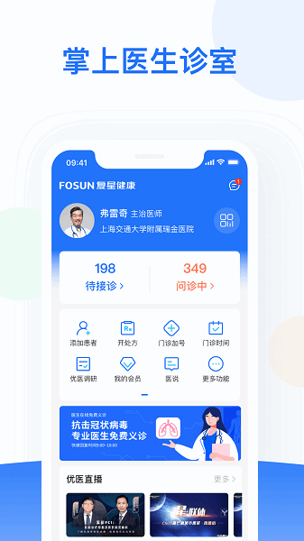 复星健康医生端,专为医生打造的管理端软件,医师可在线便捷处理患者的就诊请求,查看患者的往期病历,通过图形、语音、视频等方式便捷与患者展开沟通,在线提供医疗指导服务,接诊更加方便,有需要的医师可以下载使用!
