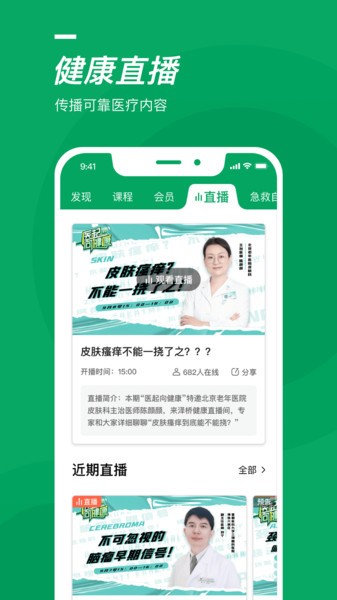 1、直播授课,名师教授在线授课直播,最新医疗知识干货等全覆盖,互动直播学习。