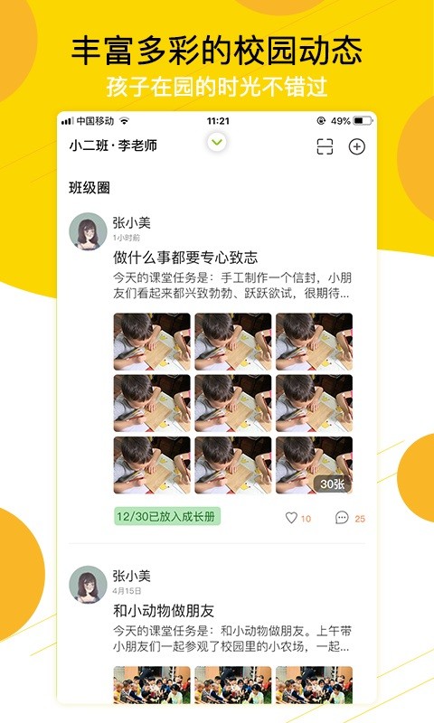 班级圈实时发布与收取幼儿学习生活的图片、视频动态;