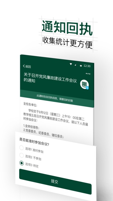 打开通知消息中心查看最新通知,马上打开该消息查看详情并选择回复内容后提交反馈