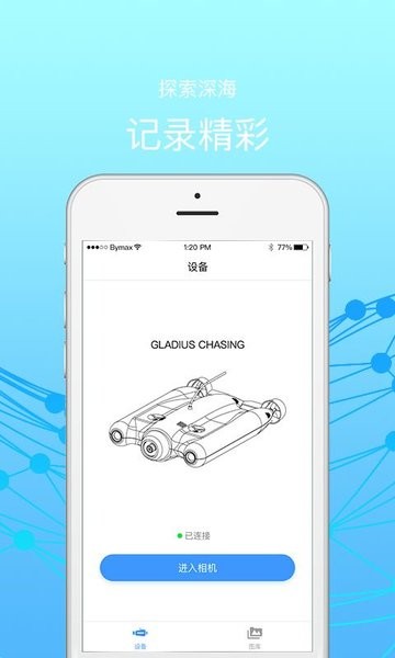 轻松连接专属潜航器,实现WIFI实时预览,同时支持对相机的即时控制,实现遥控录影,抓拍,浏览相册,将视频、照片下载到手机上等功能。 随心所欲畅游大海,探索未知海域,拍摄美丽海景。