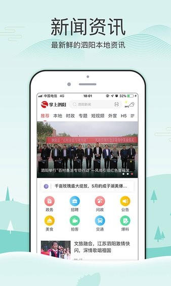掌上泗阳手机版能便捷的查看视频和文字新闻,聚焦泗阳本地新鲜事,可以参与问政,有贴心的新闻专题报道,同时还提供了政务、交通出行、招聘、美食等服务,轻松查看本地的电视节目,如果你有线索还可以爆料。