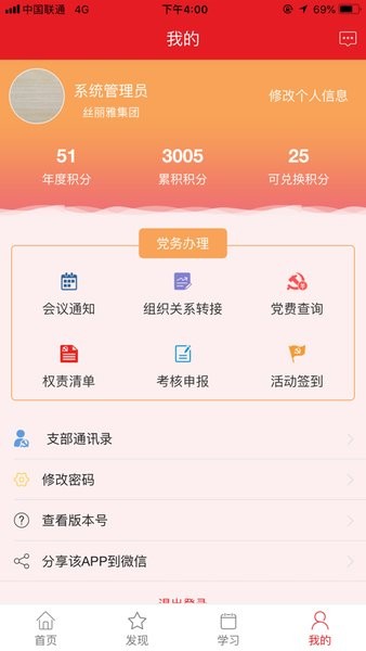 丝丽雅智慧党建app作为集团内部的党建软件,可以查看最新的党建动态,能够进行各种党务的办理,支持查党费,可以进行考核申报,能查看年度以及累计积分,可兑换的积分能够兑换商品,可以学习视频课程,支持在线参与答题闯关和考试。