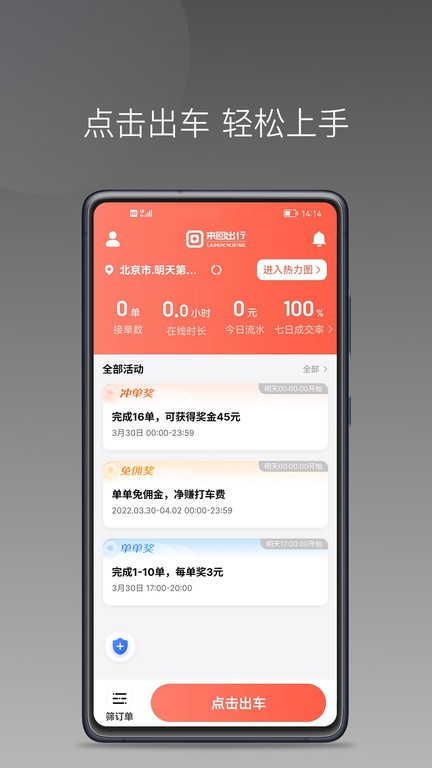 来回快车官方版这是能帮助网约车司机管理日常工作的好帮手,每笔订单都能在这里及时跟进,快速获取乘客位置并以最快速度前往目的地,同时还支持接单、抢单等操作,详情功能有需要的司机不妨来了解更多。
