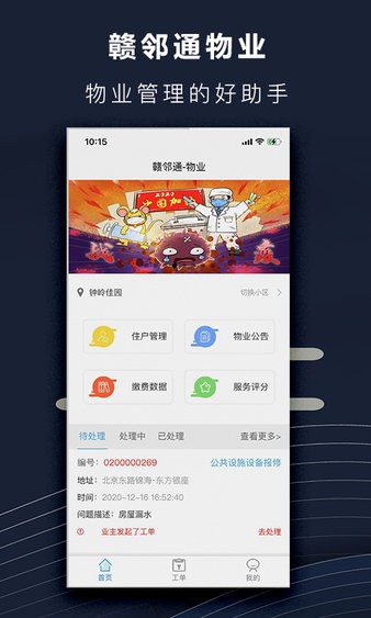 赣邻通物业软件是专为物业人员打造的物业管理app,可以推送最新的小区公告信息,能够及时查看最新的报修单并及时进行跟踪处理,能查看实时的办事进度,各个保修单的进度一目了然,还能在手机上查看详细的缴费清单。