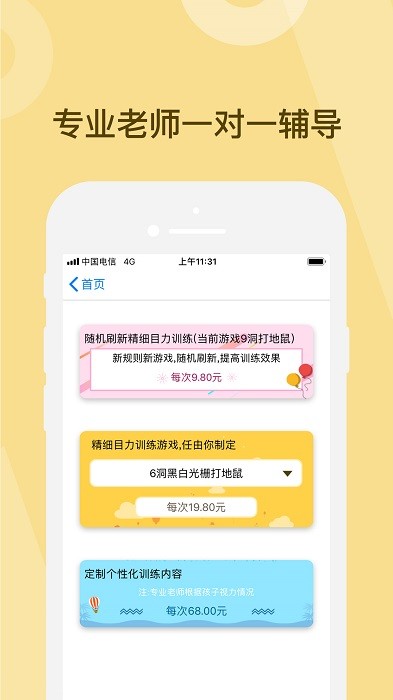2.内置的弱视训练小程序,不仅可以进行视力的检查检测,还可以训练弱视,远视弱视,斜视弱视,都可以得到治疗。