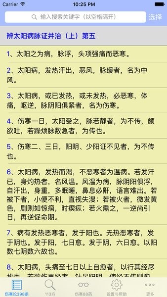 该应用以表格形式展示了伤寒论398条原文及113方内容,以及可选的金匮要略的内容,可以方便的过滤搜索条文以作研究,或者输入数字编号直接滑动到某条条文以作学习,搜索框还支持多关键字查询,只要以空格隔开就可以,还支持通配符搜索,不过通配符为“#”或“.“,搜索结果中关键字会被染红,方便观看结果。这比直接看书要方便很多,每条条文点击后会弹出一个菜单,可以选择做笔记,复制内容,或定位到条文中涉及的方药内容查看。
