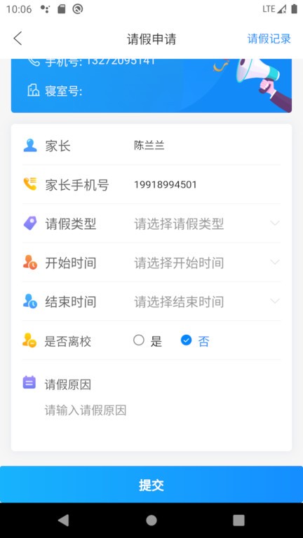 家长可以帮助孩子进行在线的假期申请,只需要填写请假的类型、假期开始的时间、以及结束的时间,就可以等待老师的审批了。