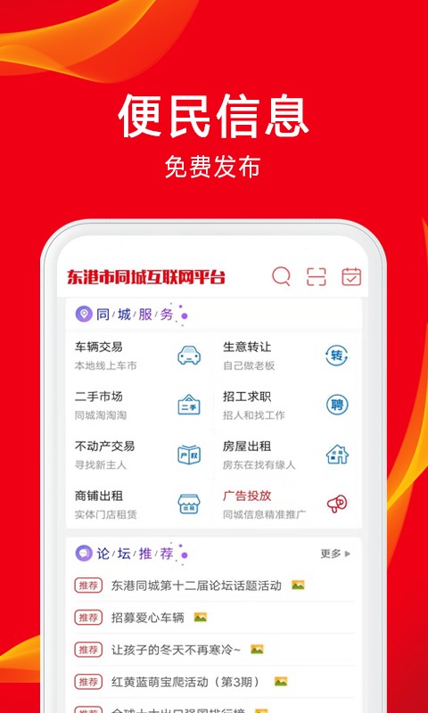东港同城app最新版是专为东港地区的用户打造的同城便民服务平台,支持在线点外卖、找跑腿和进行购物,可以查看最新的本地资讯,可以进行闲置二手交易,能够在线找工作、找房子和交易二手车,可以在线发布便民信息!