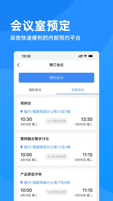 2、拥有高效便利的内部会议室预约平台,员工一键即可提交预约申请,流程简单;